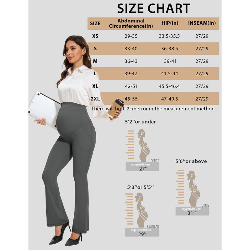 • 2 Inseam Lengths: Petite- 27" inseam fits women 5'2" or under;Regular- 29" inseam fits women 5'3"-5'5". Please refer to the size chart to choose the correct inseam length for these flare maternity pants