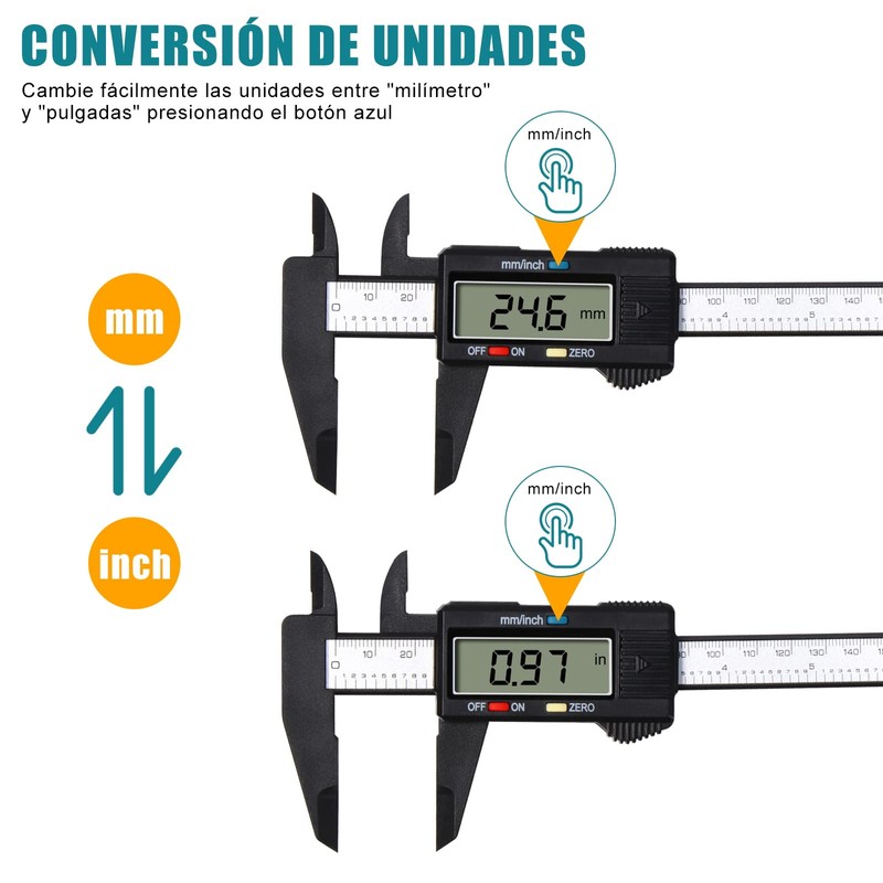 - Use: You need to press the red on/off button before using the caliper, then select the appropriate measuring jaw and the length unit according to the object to be measured, so you can start measuring. With the reset function, the compasses can be recalibrated at any time to increase accuracy. The millimeter/inch conversion function can be adapted to different user habits. The on/off button and automatic shut-off after 5-8 minutes help you save battery power.
