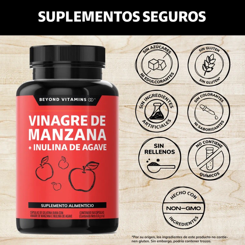 - Vinagre de Manzana + Inulina de Agave Beyond Vitamins contiene 500 mg de vinagre de manzana y 100 mg de inulina de agave. Sin rellenos. Este producto no es un medicamento. El consumo de este producto es responsabilidad de quien lo recomienda y de quien lo usa. En caso de dudas, consulte a su médico. Características de Vinagre de Manzana Beyond Vitamins: Ingredientes NON