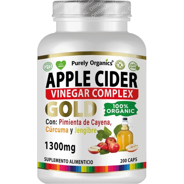 Vinagre de Sidra de Manzana orgánico. Cápsulas veganas. Con Pimienta de Cayena, Cúrcuma y Jengibre, Apple cider, 100% Orgánico, Vegan Keto. Purely Organics. (1 Unidad de 200 Cápsulas)