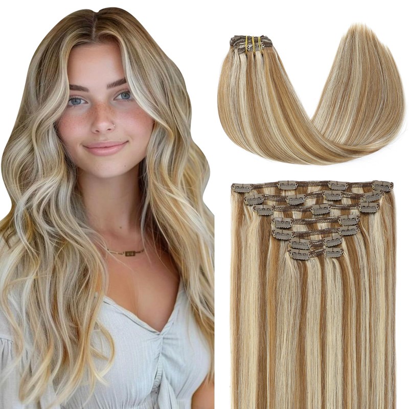 VINBAO Clip in Hair Extensions Real Human Hair 14inch 140g Ash Brown Highlighted Platinum Blonde Hair Clip in Extensions for Women, Straight Thickened Hair Extensions Clip ins 7pcs (#7C8P60, 14'')