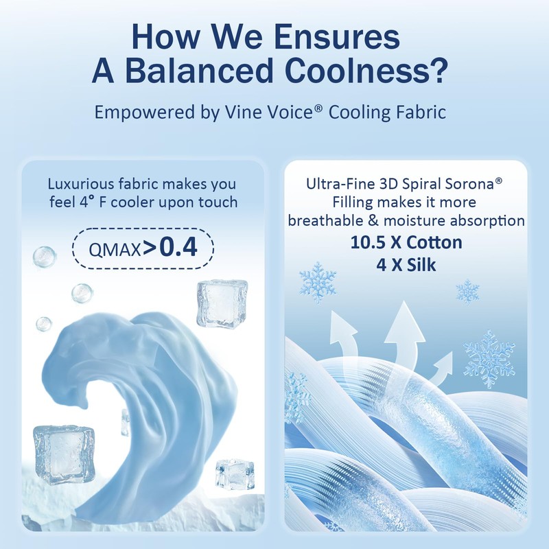 - Recyclable & Cloud-Like Comfort: VineVoice ice blanket made with 3D Spiral Sorona Fiber (5x finer than silk), offer eco-friendly softness. 37% of Sorona is plant-based, reducing energy use by 30% and CO₂ emissions by 63%. Sonora fabric presents you with cloud-like fluffiness and balanced coolness, excellent moisture-wicking properties,cooling quilt duvet providing you comfortable sleep.