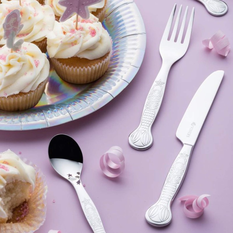 - 4 PIECE SET | This Viners cutlery set is perfect for children as they grow and learn to eat independently. The set includes one table knife, one table fork, one dessert spoon and one tea spoon, packaged in an underwater mermaid-themed gift box