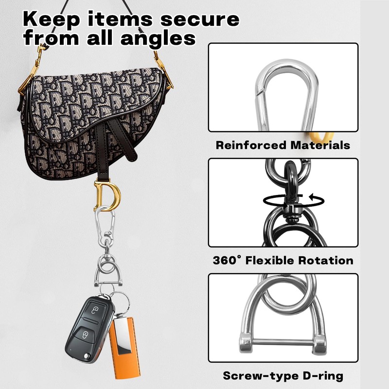 Functions Our keychains feature a screw D ring that prevents items from falling off or being stolen easily. The 360 degree rotation function prevents tangling. The high-quality zinc alloy material is polished and electroplated, making it durable, smooth and scratch resistant.