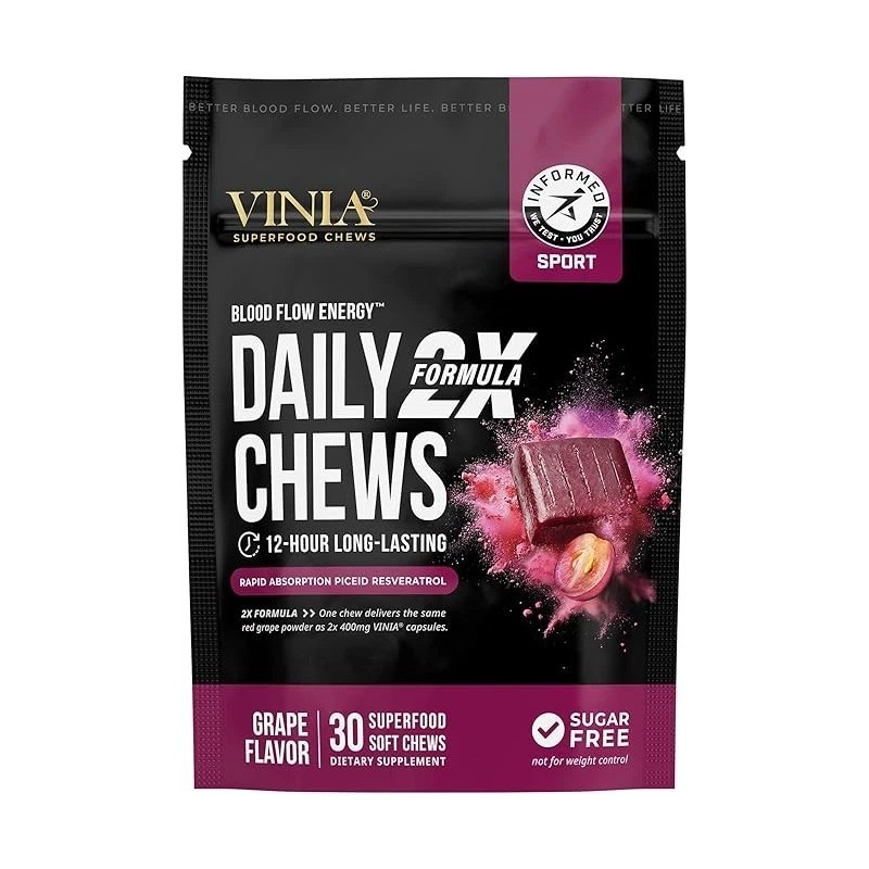 - RED GRAPE CELL CHEWS FOR BLOOD FLOW & CIRCULATION: Enjoy the benefits of red wine—without the alcohol or sugars—in every convenient chew. Each VINIA DailyChew delivers the same red grape cell polyphenols as 2 VINIA capsules, 2,000 grapes, or 2 bottles of red wine. Designed to boost Nitric Oxide (NO) and reduce Endothelin-1 (ET-1), it increases arterial dilation and improves healthy blood flow, supporting the delivery of more oxygen and vital nutrients throughout the body.