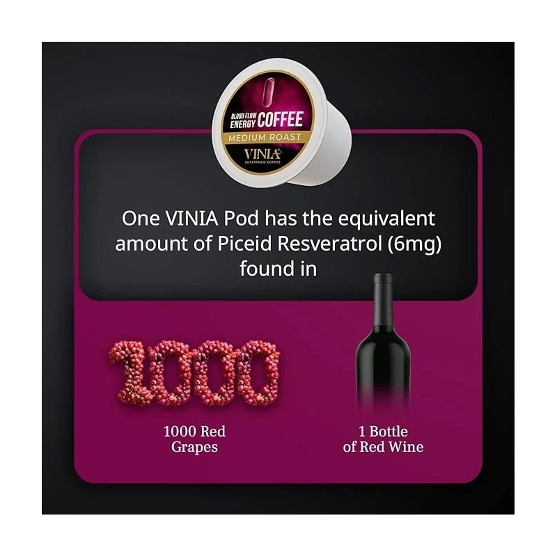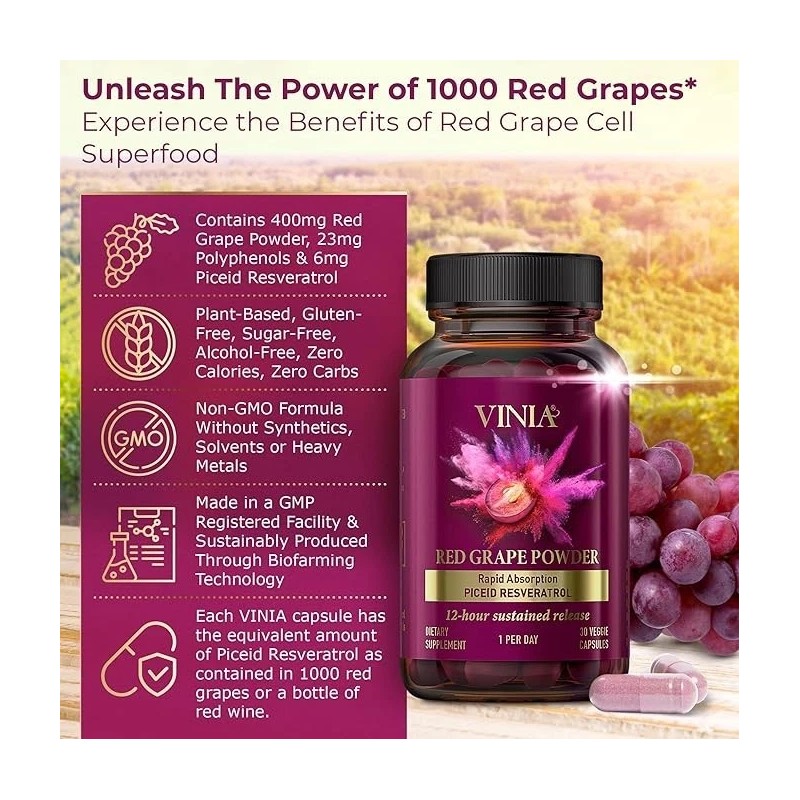 - CLINICALLY BACKED RED GRAPE SCIENCE: VINIA is the only chewable supplement made from red grape cells containing Piceid Resveratrol — a breakthrough ingredient backed by 4 clinical studies, 14 global patents, 8 scientific publications, and 17 years of R&D. Its dual mechanism increases Nitric Oxide (NO) and reduces Endothelin-1 (ET-1), supporting vascular function and healthy blood flow.