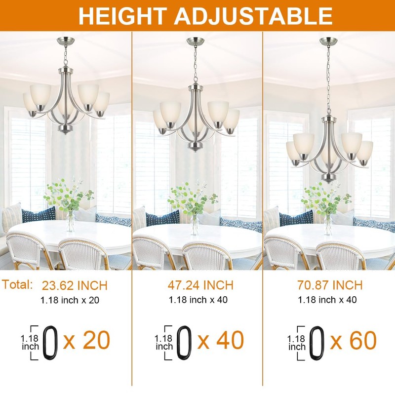 - Dimentions: Chandelier: 24''(D)×72''(max-H) ; Glass shade: 5.12''(D)×4.72''(H); Canopy:5.12''(D), fully adjustable designer chain allows you to customize the fixture to your lighting needs and desired look