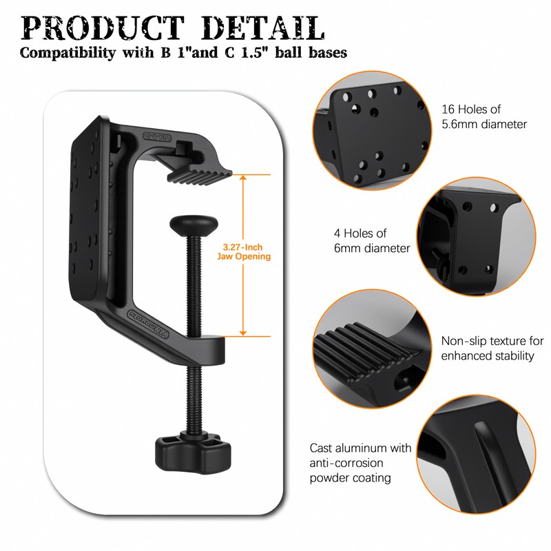 - Wide range of applications: This C-clamp has a maximum clamping distance of 3.23 inches and can be securely attached to boats, workbenches, fences, tables, etc. It is ideal for fish finder mounts and tablet mounts