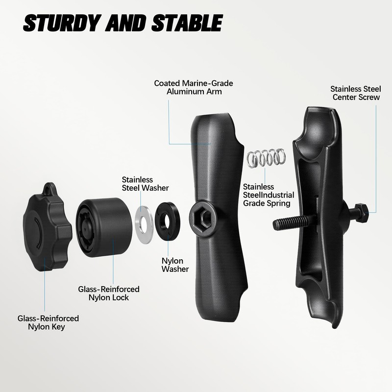 - Construction - Crafted from powder-coated marine-grade aluminum alloy with stainless steel hardware, this ball mount arm withstands the harshest environments. Salt spray tested for thousands of hours, it resists high salt water corrosion while maintaining structural integrity, making it ideal for marine applications.
