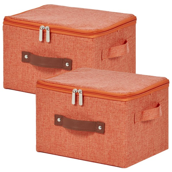 VinneGenzz 2 Pack Storage Bins with Zipper Lid Cotton Linen Fabric Lidded Storage Baskets Boxes Foldable Washable Closet Shelf Clothes Organizer Container with PU Leather Handles (Orange, Small)