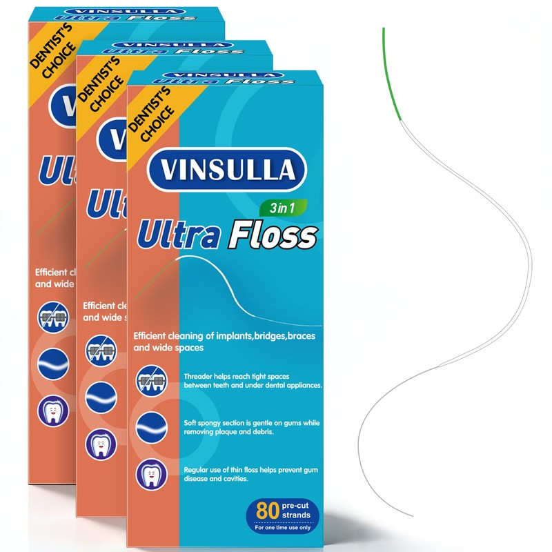 VINSULLA Dental Floss for Braces, Floss Threaders for Bridges and Implants, PTFE & PFAS Free Floss, 80 Pre-Cut Strands (Pack of 3)