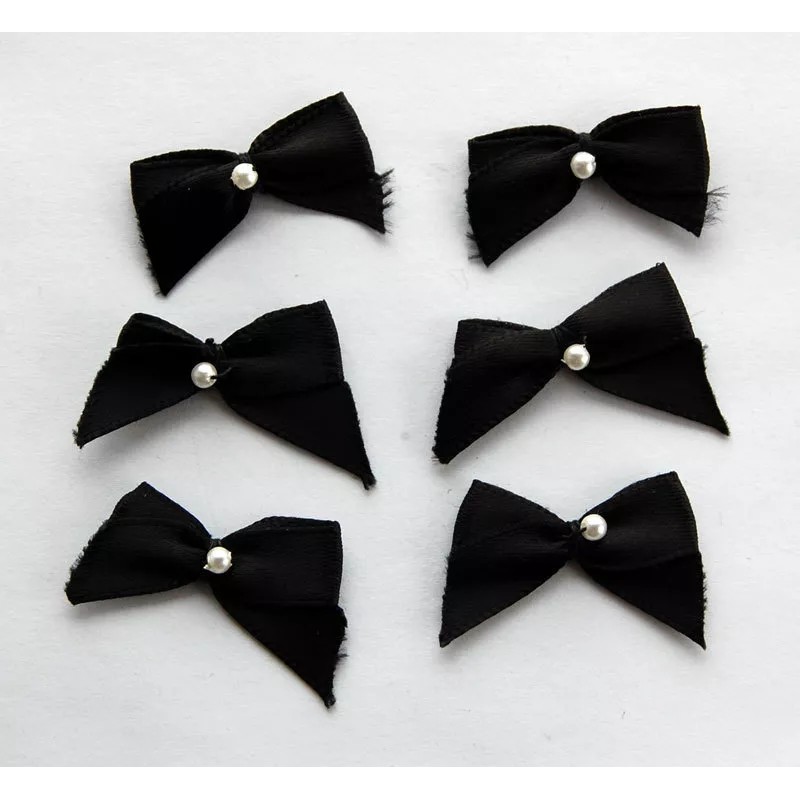 VINTAGE 6 TINY BLACK FABRIC PEARL BOWS • DOLL MAKING