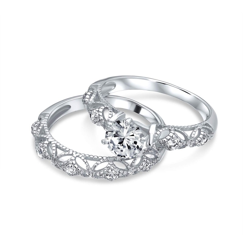 Vintage Style 1CT Round Solitaire Milgrain AAA CZ Engagement Wedding Band Ring Set For Women .925 Sterling Silver