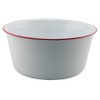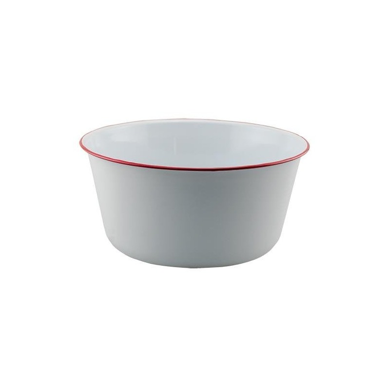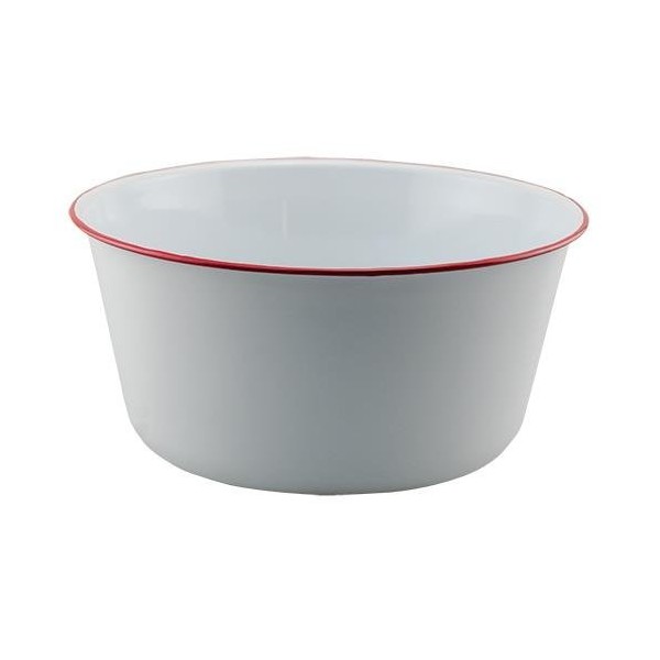 - Enamel Mixing Bowl is a white enamel bowl with a vibrant red trim.