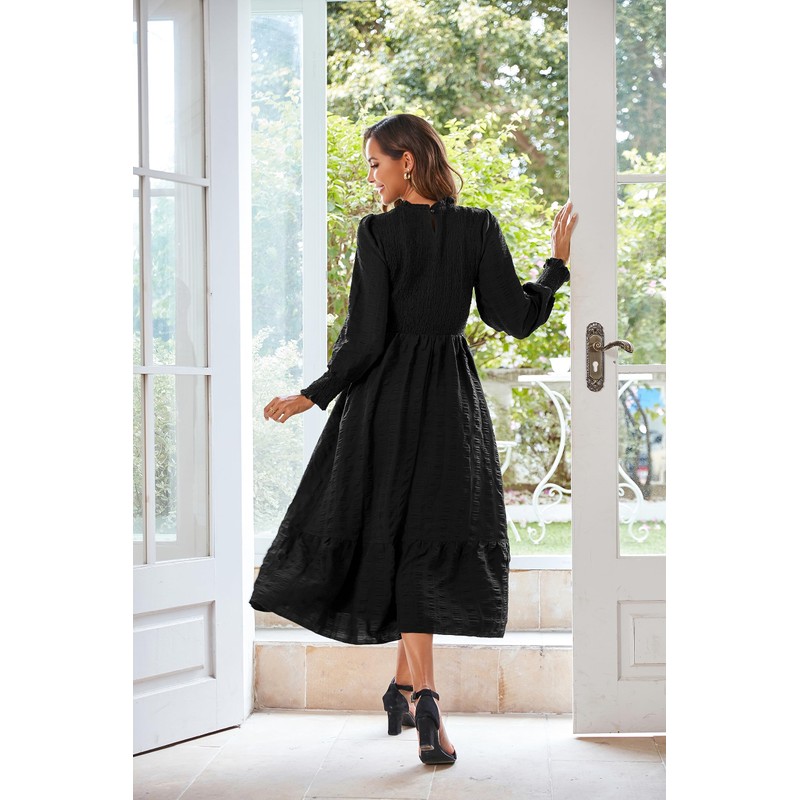 - Features: This Long Sleeve Smocked Midi Dress features a crew neck with ruffle trim design, Single Keyhole Button Closure In The Back, Long loose Puff Sleeve with Stretchy Smocked cuffs, Two Side Pockets Are A Plus Convenient For You To Carry Some Small Things, Classical Solid Color, popular ruched bodice design, elastic waist with a floaty tiered long skirt, This dress embodies the essence of the upcoming fall season, offering a delightful blend of elegance, comfort, and versatility.