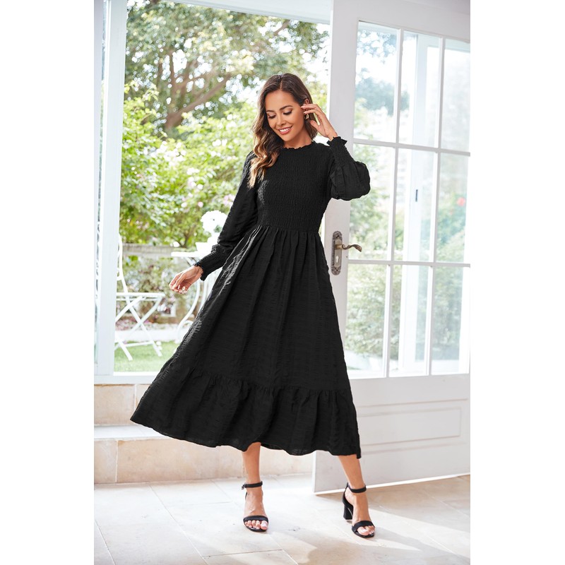 - Features: This Long Sleeve Smocked Midi Dress features a crew neck with ruffle trim design, Single Keyhole Button Closure In The Back, Long loose Puff Sleeve with Stretchy Smocked cuffs, Two Side Pockets Are A Plus Convenient For You To Carry Some Small Things, Classical Solid Color, popular ruched bodice design, elastic waist with a floaty tiered long skirt, This dress embodies the essence of the upcoming fall season, offering a delightful blend of elegance, comfort, and versatility.