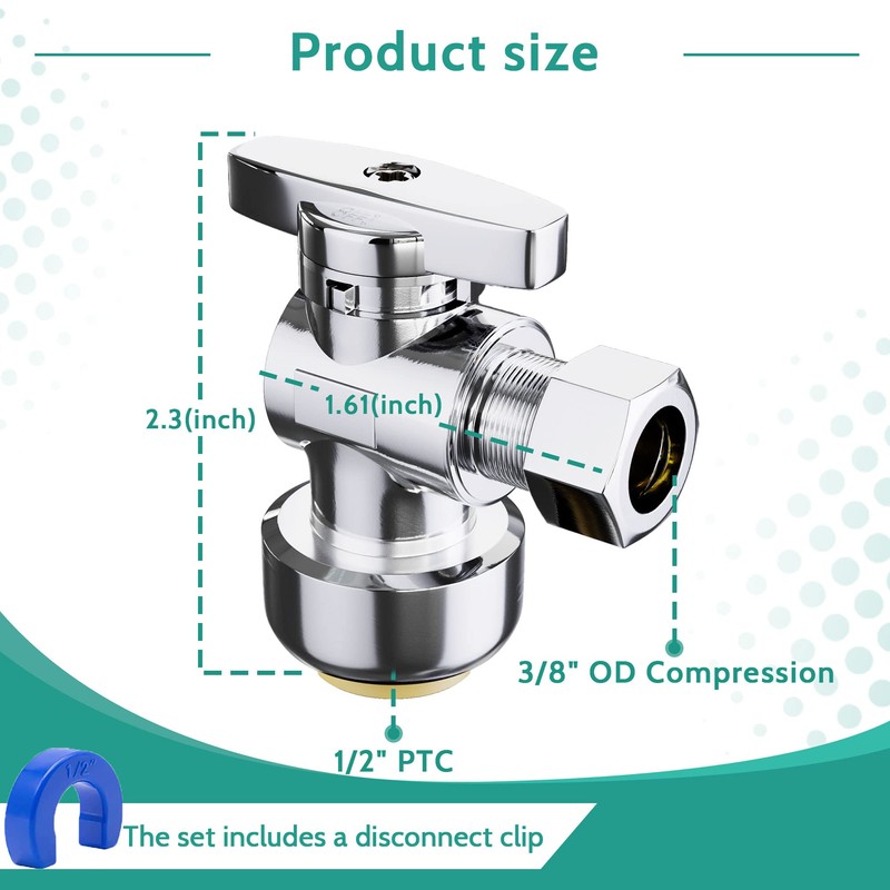 - 【Package Include】:5 Pieces 1/2 inch Ptc x 3/8 inch OD compression water shut off valve, 1 piece disconnect clip.