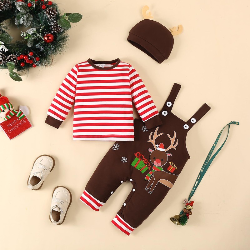 - Design: Cotton overalls pant+long sleeve stripe T-Shirt+ buckhorn hat,3pcs outfits set for baby boys,Reindeer pattern overall pants are suitable for Christmas,Snap closure,easy for putting on and taking off,also easy for changing diaper.Classic stripes T-shirt are very cute and fashionable,adorable hat with buckhorn.