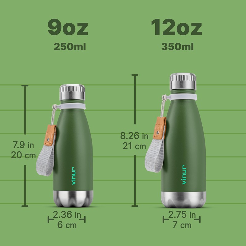 - 18/8 STAINLESS STEEL: All of VINUR's water bottle are carefully crafted from high quality stainless steel and are BPA and phthalate free. The interiors are electrolytically polished and odorless.The exterior is finished with a smooth, long-lasting powder coat in bold, vibrant colours that offer greater resistance to peeling and fading than lacquer.