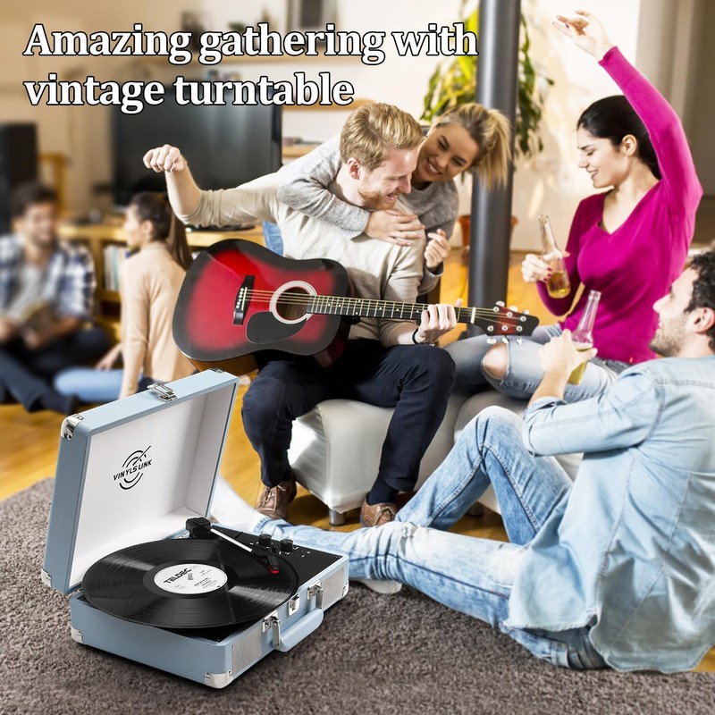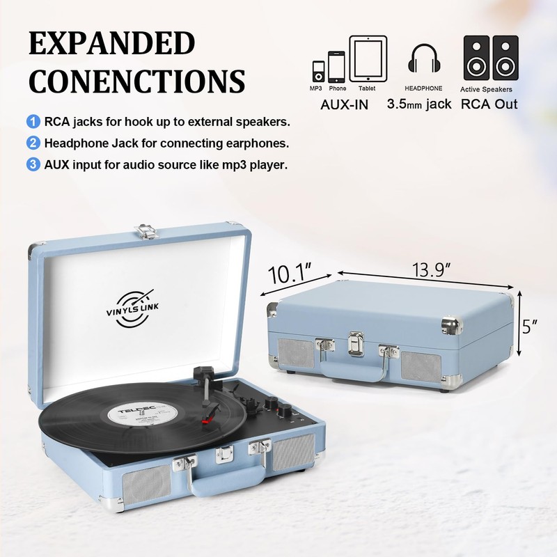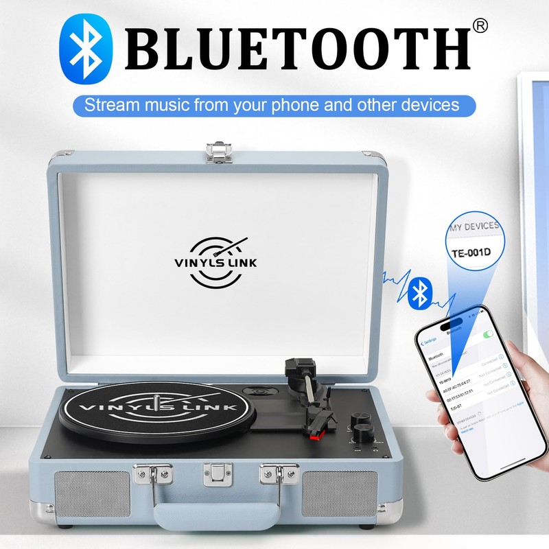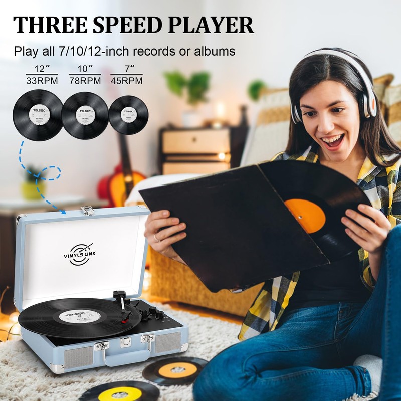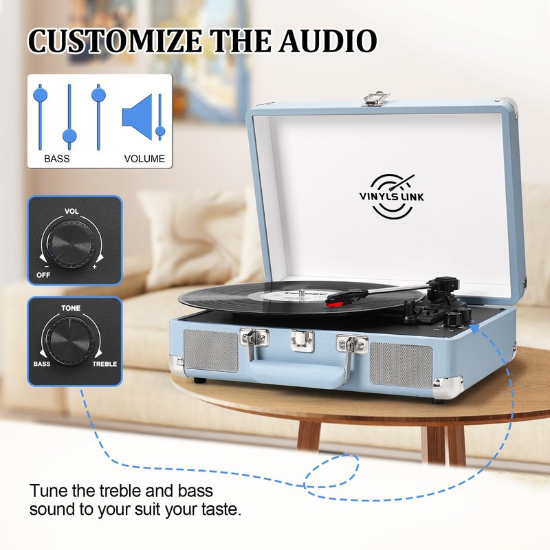 VINYLS LINK Vinyl Record Player, Portable Suitcase Turntable with Bluetooth Playback, 3-Speed LP Player, Built-in Stereo Speakers, Headphone Jack, AUX Input, RCA Output, Bass/Treble Control & Auto Off