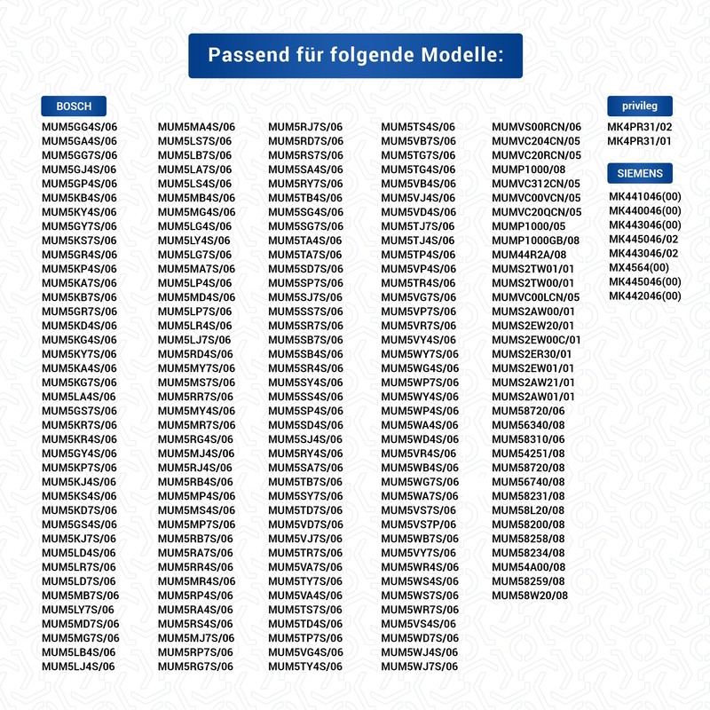 - Suitable for: the replacement for Bosch MUM5 dough hooks and Bosch dough deflectors are suitable for the following models: Compact, Exclusiv, Family Microtronic, Microtronic, MUM series, OptiMUM
