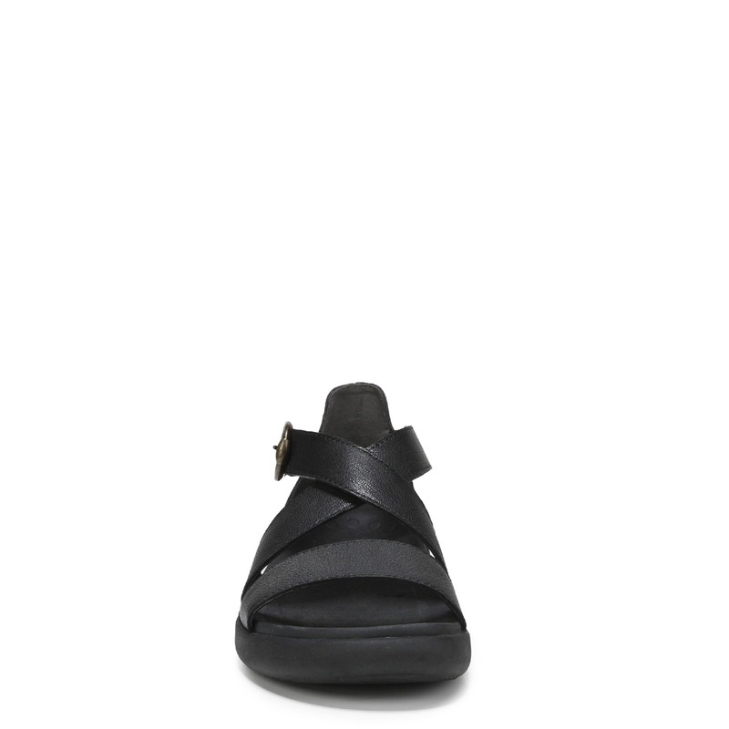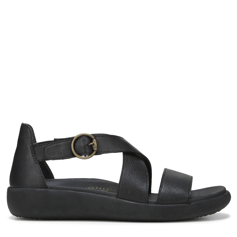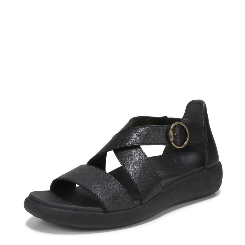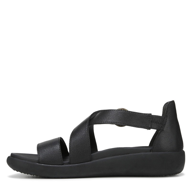 - Women's sandal with a soft, relaxed construction, it features an elastic heel for comfort, a supportive cross band strap, and a contoured massaging footbed