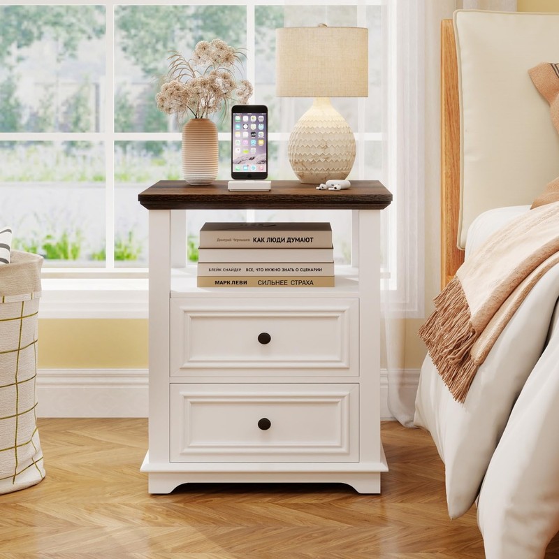 Vipbear Farmhouse Nightstand with Charging Station 18" White Night Stand Set of 2 Drawers Wood Bedside End Table Modern Wood Bed Side with Open Shelf Storage for Bedroom,Living Room