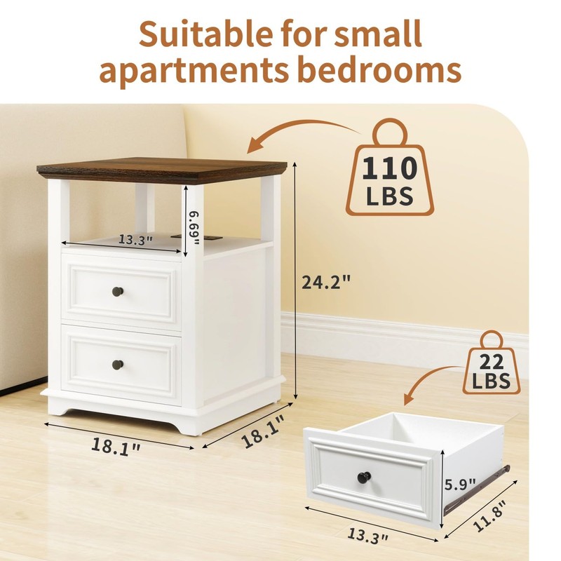- 【Night Stand with 2 Drawers Storage System】2 smooth-gliding drawers (metal runners); Open shelf for quick-access items; Adjustable layout for books, CPAP machines, or baskets.18"H height fits snugly beside bedroom or deep sofas side.