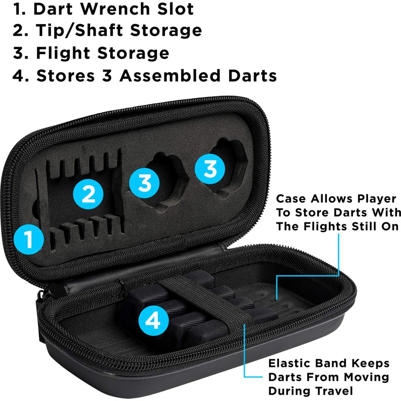 - Darts and accessories are stored and protected in a premium TacTech case, which features a tough outer shell and a form fitting interior