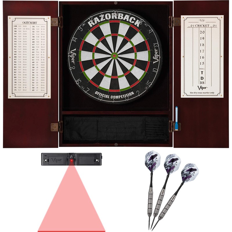Viper Metropolitan Mahogany Steel Tip Dartboard Cabinet, Viper Razorback Sisal Dartboard, Viper Underground Raven Steel Tip Darts 25 Grams, and Viper Dart Laser Line