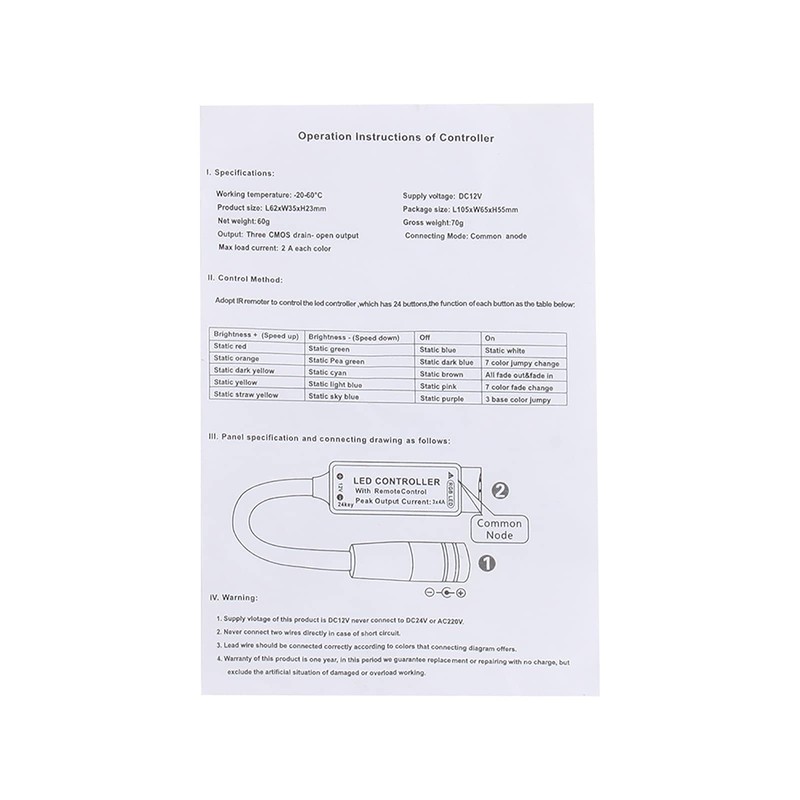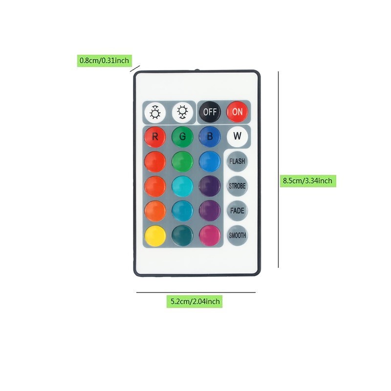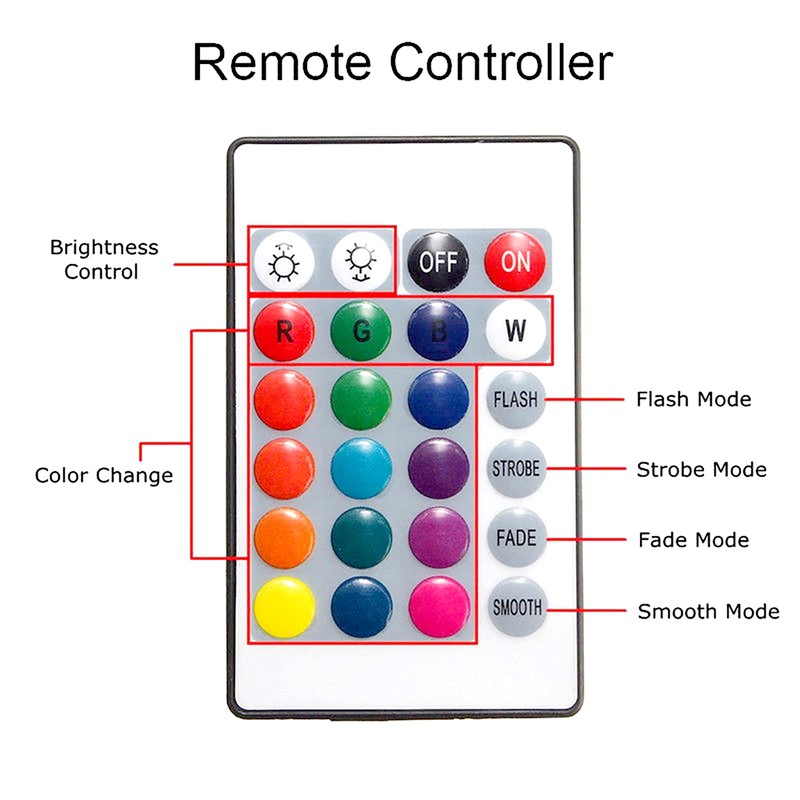 • 16 colors, adjustable brightness, On/Off, 5 Light Patters: Flash, Strobe, Fade, RGB Smooth-change, Static.16-Speeds Control in Flash / Strobe / Fade-change / RGB Smooth-change