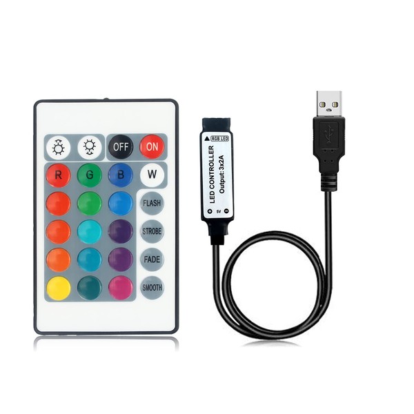 VIPMOON 24 Key IR Remote Control, DC 5V 1m USB Inline IR Controller with 24 Key Wireless Controller for 5050 2835 RGB LED Light Strip