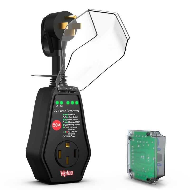- PORTABLE 50 AMP RV SURGE PROTECTOR WITH EXTRA MODULE – 12,000 JOULES OF PROTECTION: The VIPTOO surge protector detects faulty power sources and safeguards your RV and onboard electronics during major power surges, lightning strikes, or outages. Note: This product includes one extra replaceable surge module for added convenience and long-term value