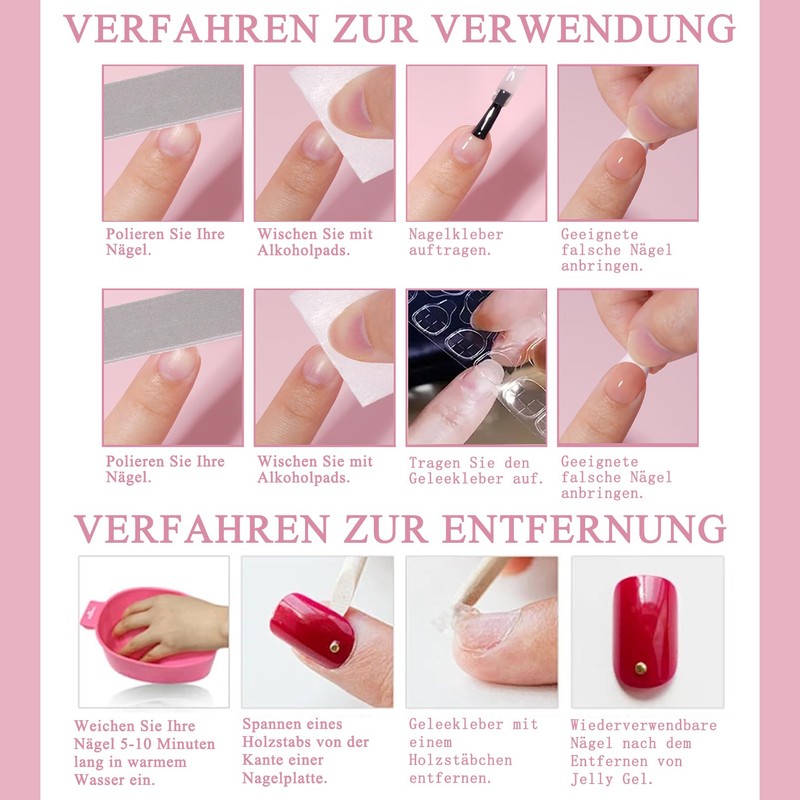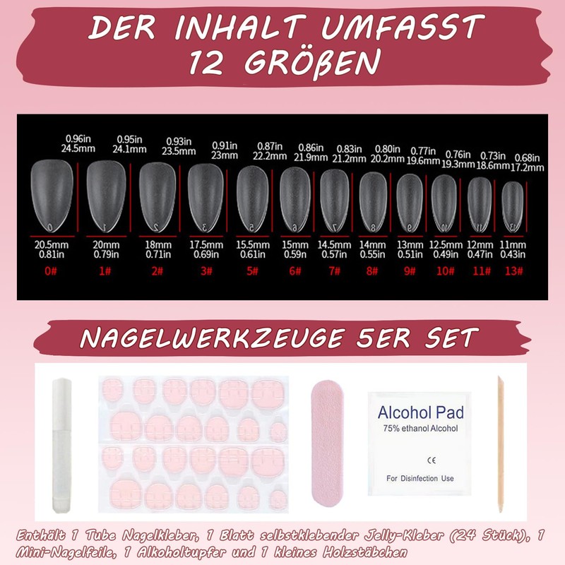 - Das Paket beinhaltet: 24 Stück Nägel zum Aufkleben, 1 Blatt selbstklebenden Jelly-Kleber (24 Stück), 1 Tube Nagelkleber, 1 Stück Mini Nagelfeile, 1 Stück Holzstab und 1 Alkoholtupfer.