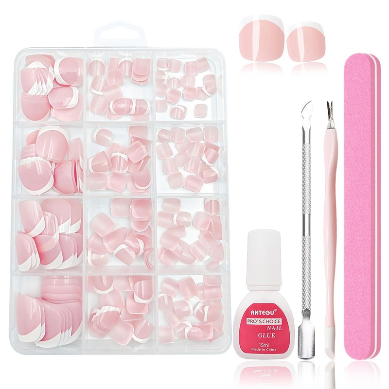 - False toenail set: Our false toenails set contains 240 artificial nails. The tools include 1 tube of 15 ml nail glue, 1 nail file, 1 nail steel pusher and 1 exfoliating fork. Regardless of the size or width of your nails, you can choose the best French nail paste for women.