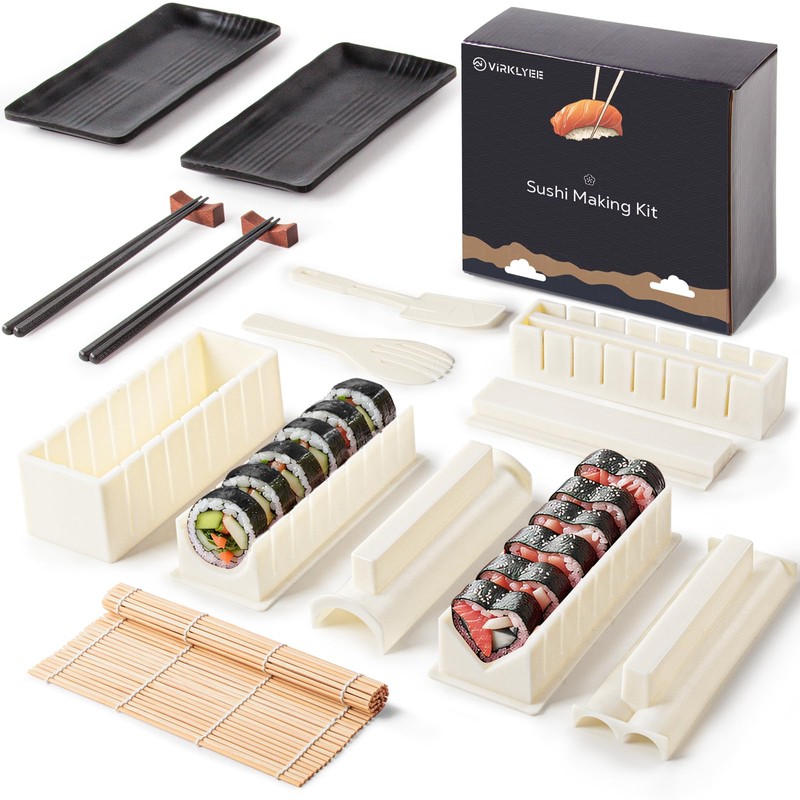 - Sushi maker for beginners: complete sushi set with tools, including 8 sushi moulds in different shapes, 1 rice fork, 1 spatula with non-stick coating, 1 bamboo roll-up, 2 pairs of chopsticks, 2 plates and 2 stick holders.