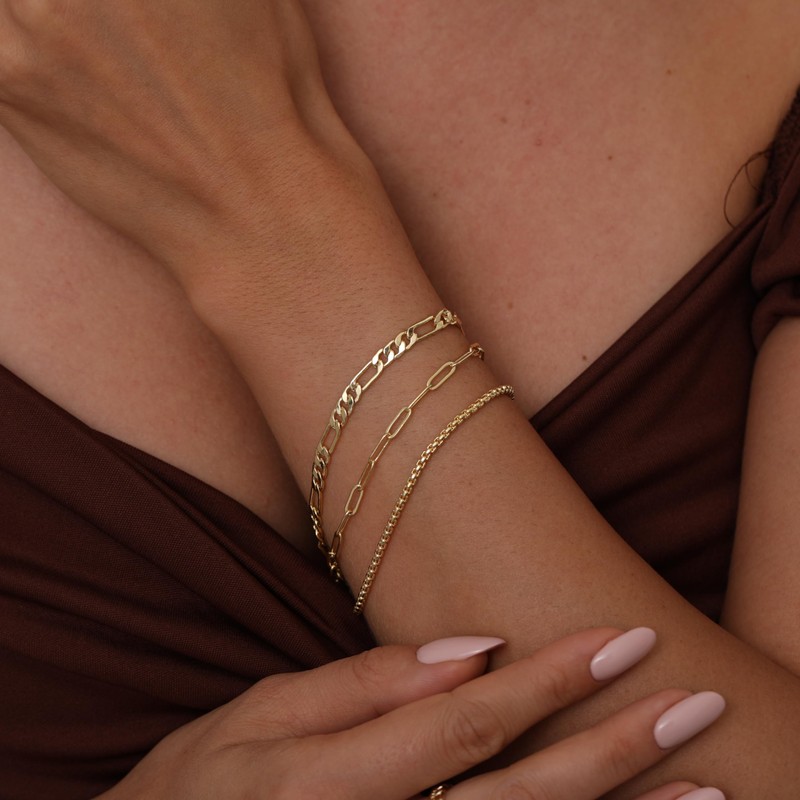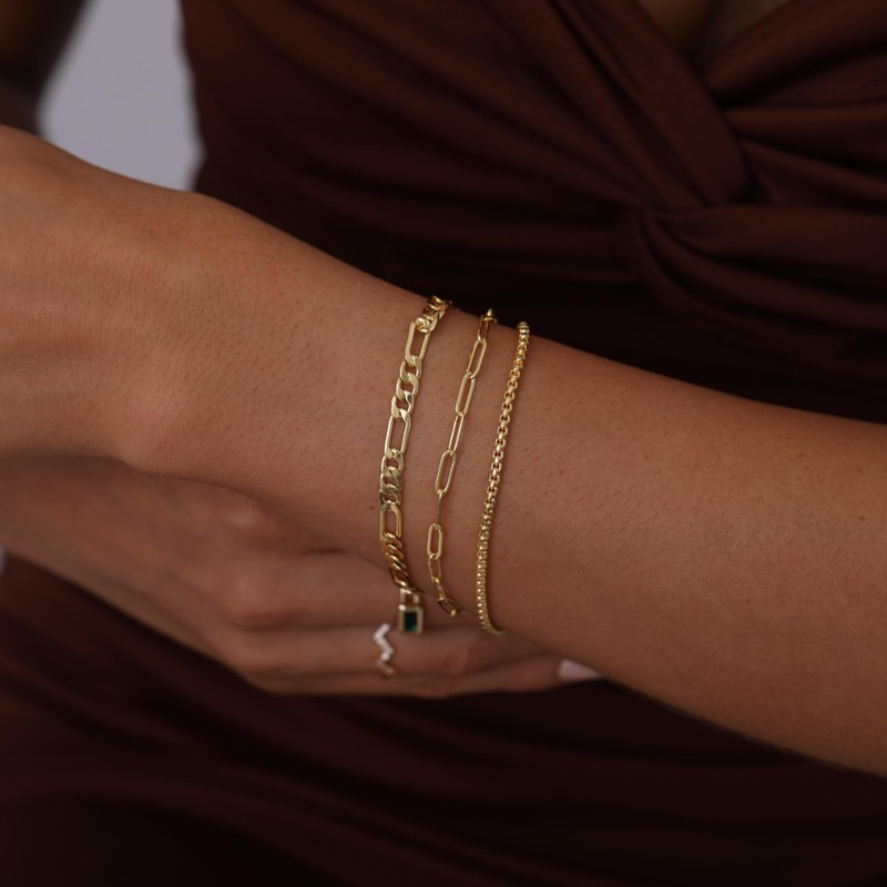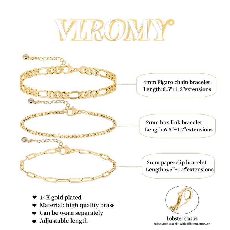 - 1.【3 Separate Layered Bracelet】: It comes three separate chains : 2mm box link bracelet; 4mm Figaro chain bracelet; 2mm paperclip bracelet ; Each Bracelet length 6.5”+1. 2” extender.