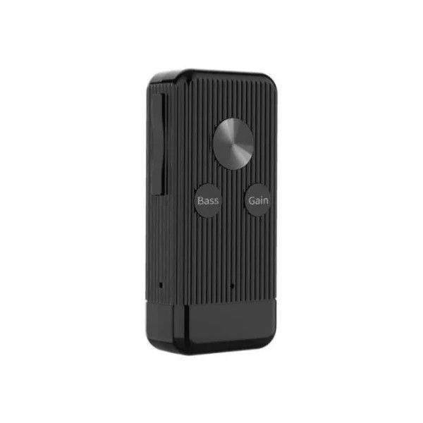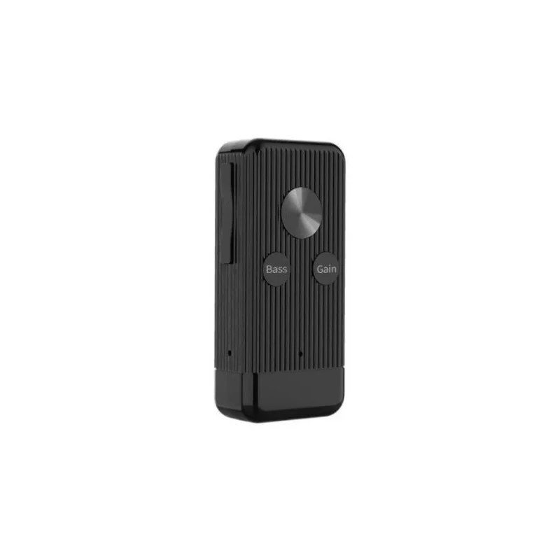 Receptor audio para autos, teléfonos, tabletas, computadoras y bocinas. Amplifica la señal en potencia de bajos, botón dedicado para bass. Cuenta con botón de cancelación de ruido para llamadas, subir y bajar volumen, Botón multi función y ranura SD para música.