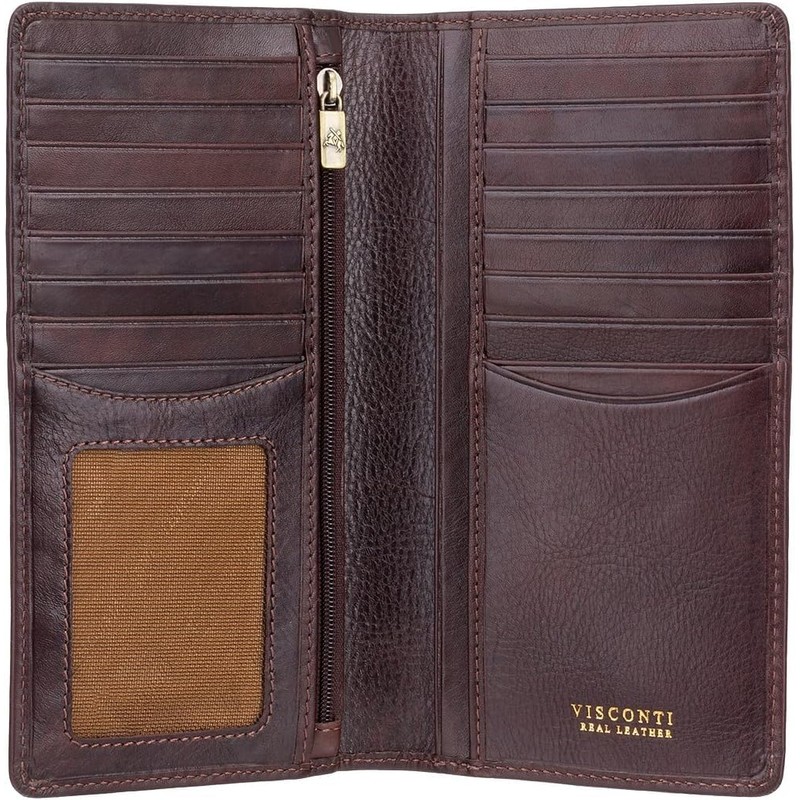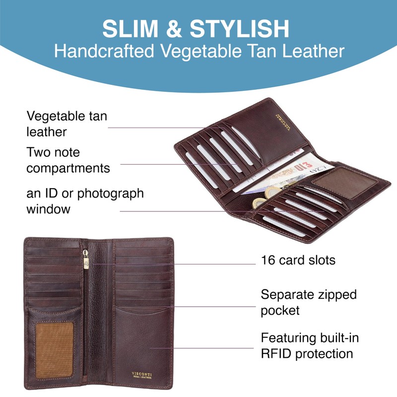 VISCONTI - Men’s Brown - Veg Leather Wallet – RFID Protection for Credit Cards, Notes & ID – 16 Card Slots, 4 Note Sections, 2 Zipped Pockets, ID Window – with Signature Logo