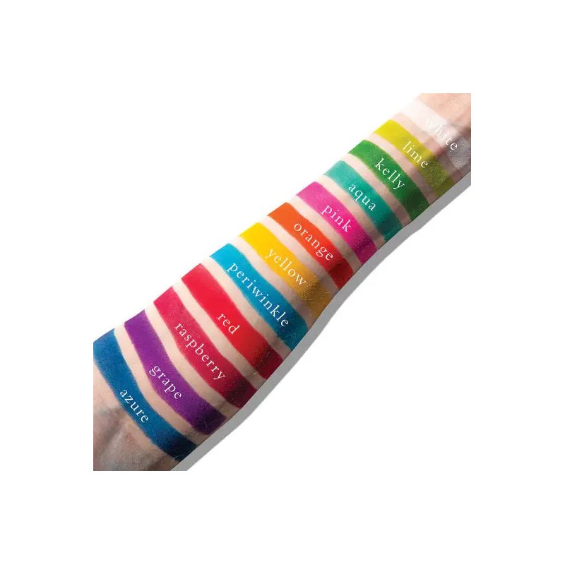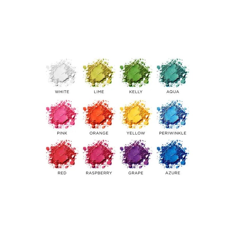 Shade 1 (White): Talc, Mica, Octyldodecyl Stearoyl Stearate, Octyldodecanol, Zinc Stearate, Octyldodecanol, Potassium Sorbate, Sodium Benzoate. Shades 2 (Lime), 3 (Clover), 4 (Aqua), 5 (Pink), 6 (Orange), 7 (Yellow), 8 (Periwinkle), 9 (Red), 10 (Raspberry), 11 (Grape), 12 (Azure): Talc, Mica, Octyldodecyl Stearoyl Stearate, Zinc Stearate, Octyldodecanol, Potassium Sorbate, Sodium Benzoate. (+/- may contain: Yellow 5 CI 19140, Titanium Dioxide CI 77891, Blue 1 CI 42090, Red 28 Cl 45410, Red 6 Lake CI 15850, Red 7 Calcium Lake CI 15850, Ferric Ferrocyanide CI 77510, Red 40 CI 16035, Iron Oxides CI 77492/CI 77499).