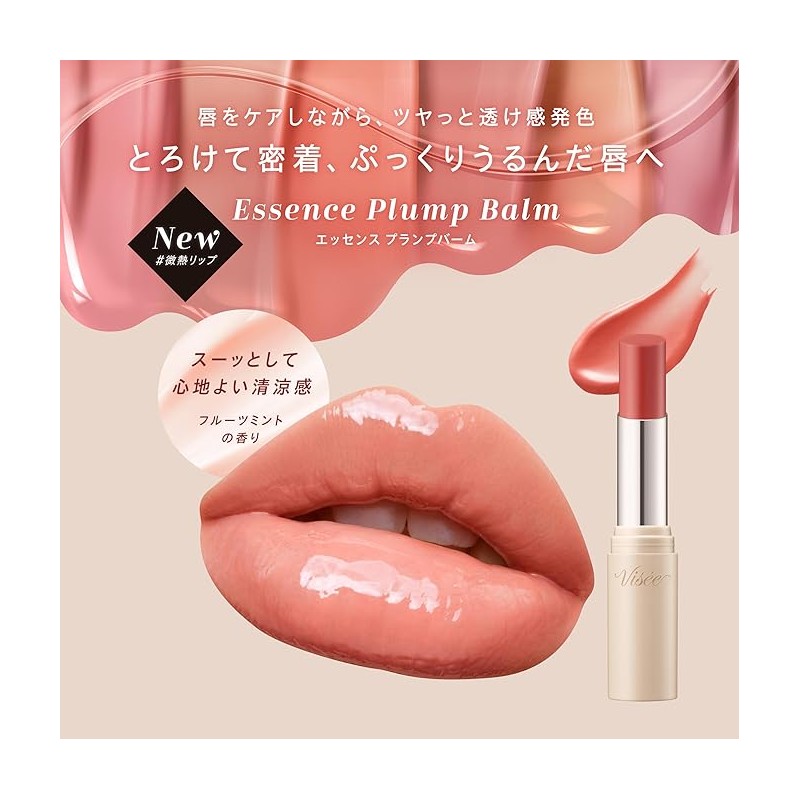 Visee Essence Plump Balm PK881 Mute Peach 3.3g – Glossy, Moisturizing Lip Plumper with Beauty Serum & Refreshing Feel