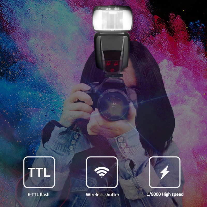 1、Powerful function. Support TTL flash, manual flash, strobe flash, 1/8000s high-speed sync, front-curtain sync, and rear-curtain sync. 2、2.4GHz frequency, effective trigger distance of about 25m/82ft, ans it can be used as as both main light and slave light, supporting for three groups of A/B/C and 4 channels. 3、With an AF assist lamp, which increases the likelihood of successful focusing in low light or low contrast conditions. When it is difficult to focus, the red focus light will automatically on to help autofocus. 4、Flash coverage can be set to auto zoom and manual zoom, which ranges from 24 to 105 mm. Built-in wide-angle diffuser enables flash shooting with ultra-wide-angle lenses up to 14 mm wide. 5、Flash output power range from 1/1 to 1/128, color temperature of 5600k ± 200K, widely applicable to portrait photography, wedding photography, event photography, travel photography, still life photography, etc.