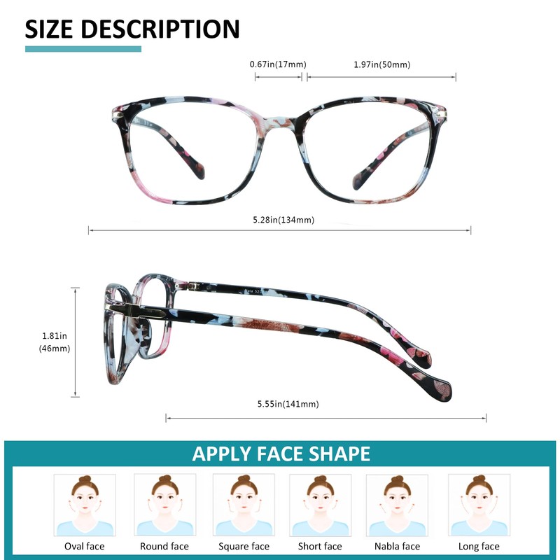 - Material: frame TR90, 11g, ultra lightweight, no pressure on ears for long time wearing. Resin Lens , square shaped frames with a pink pattern, crafted with reinforced metal hinges to ensure durability and avoid breaking.