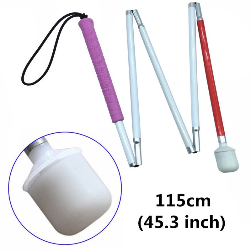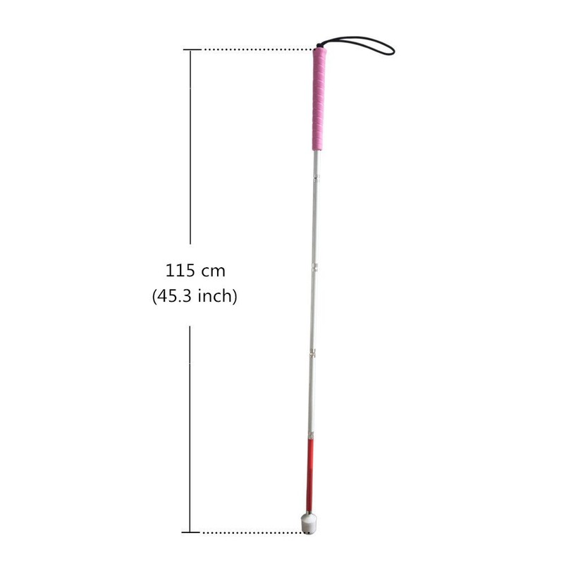 This Aluminum white cane is durable and flexible, it is lightweight and come with a large diameter tip made of long life super tough polymer and it has a firm rubber grip handle.New joint design provides superior tactile transmission. Canes fold and unfold with ease.* Rolling tip, folds down 5 sections.* Double elastic cord assembly for added security* Hook style tip- with the security of the tip held in place with the elastic cord.* White and red reflective for nighttime visibility.* Length:115cm