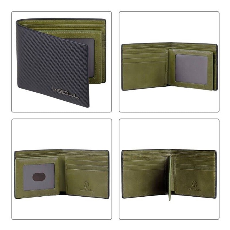 VISOUL Mens Bifold Wallet with 2 ID Windows Carbon Fiber Leather, RFID Blocking Multi Card Holder Wallet with 2 Money Compartments, Stylish Two-Tone Back Pocket Wallet for Men (Black+Green)