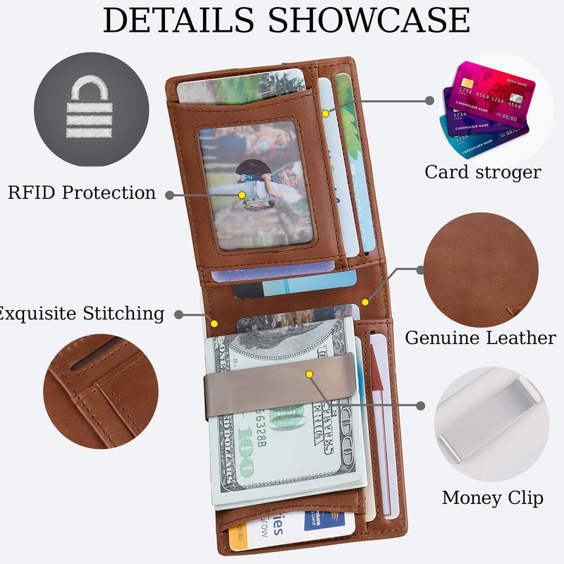 - Small flat. The thin, small wallet offers 9 card slots, 1 money clip, 1 ID window. Dimensions: 8 x 11 x 1.5 cm