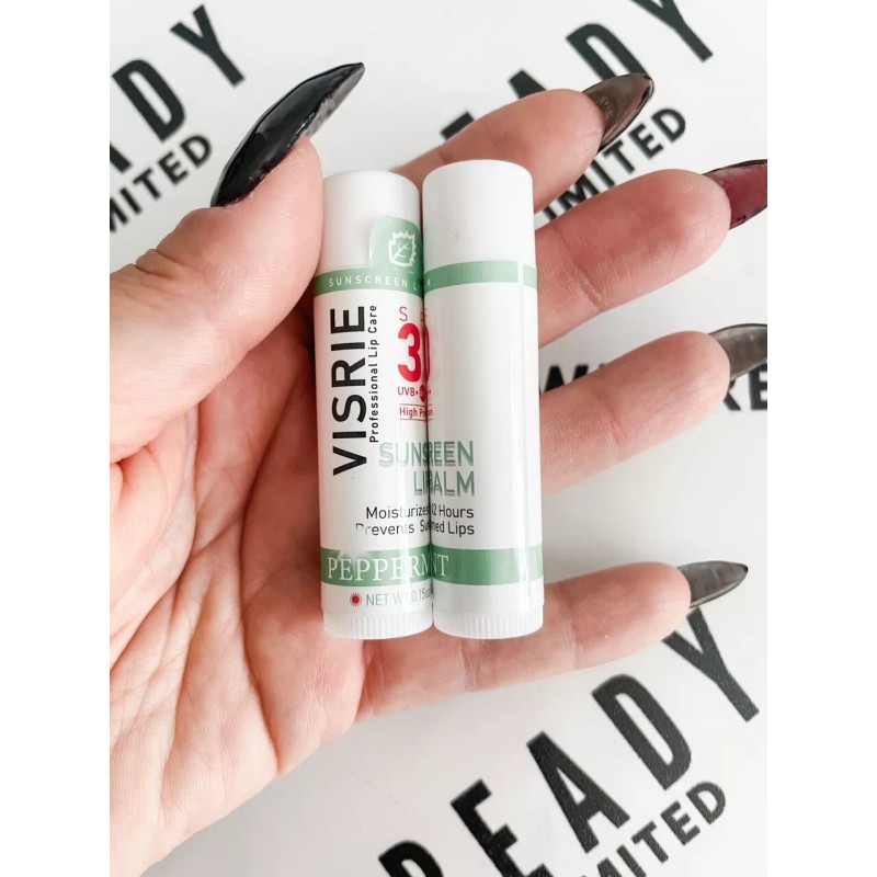 Brand/ Company: Visrie Item Name: Lip Balm with Sunscreen SPF30  Size: 0.15oz / 4.2g x 2 Color or Scent: Clear, no colorants. Peppermint