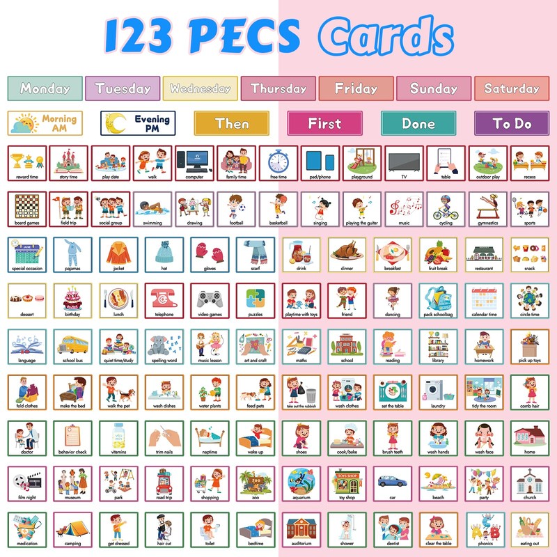 - 📦【Weekly Routine Chart】You will recieve a 24 x 68 cm visual board, 123 PECS Paper Cards. It's a great tool for setting an instant visual schedule for children with autism.