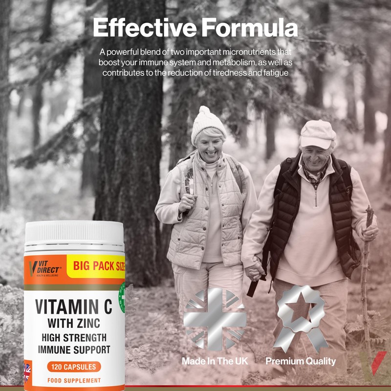 Vit Direct - Vitamin C with Zinc - High Strength - 90 Vegan Capsules - Supports Muscle Growth - Reduces Tiredness & Fatigue - VIT C & Zinc Daily Supplements - Long-Term Support