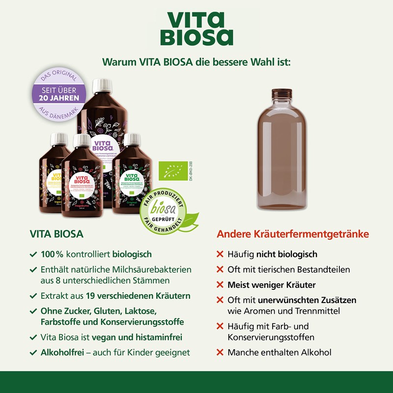 • ✅ Was ist in Vita Biosa enthalten? Active lactic acid cultures and an extract of 19 different herbs - all from controlled organic cultivation (kbA).